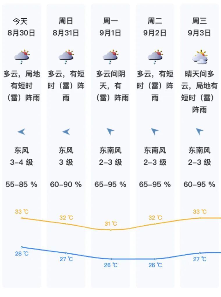 【周六天气】多云,局地有短时(雷)阵雨;偏东风沿海、高地和海区最大阵风8级左右;气温28-33℃,中午前后较热。