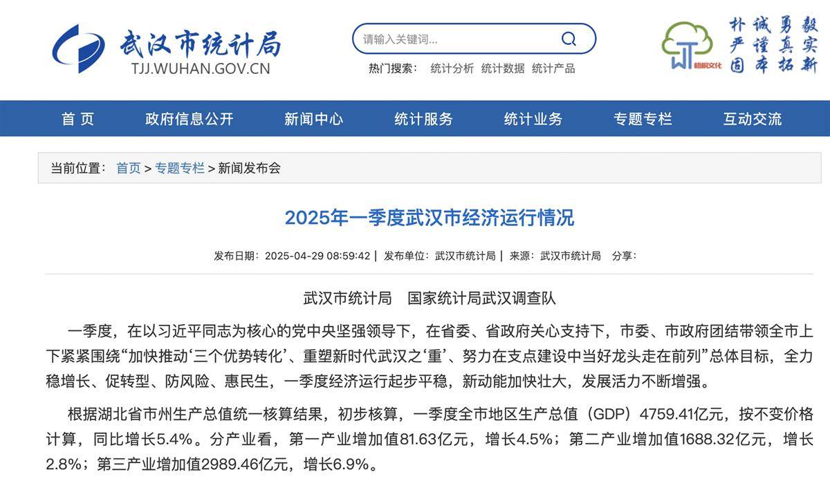 湖北日报讯(记者朱惠)“一季度经济运行起步平稳,新动能加快壮大,发展活力不断增强。”4月29日,武汉市统计局、国家统计局武汉调查队联合发布2025年一季度武汉市经济运行情况——全市地区生产总值(GDP)为4759.41亿元,按不变价格计算,同比增长5.4%。